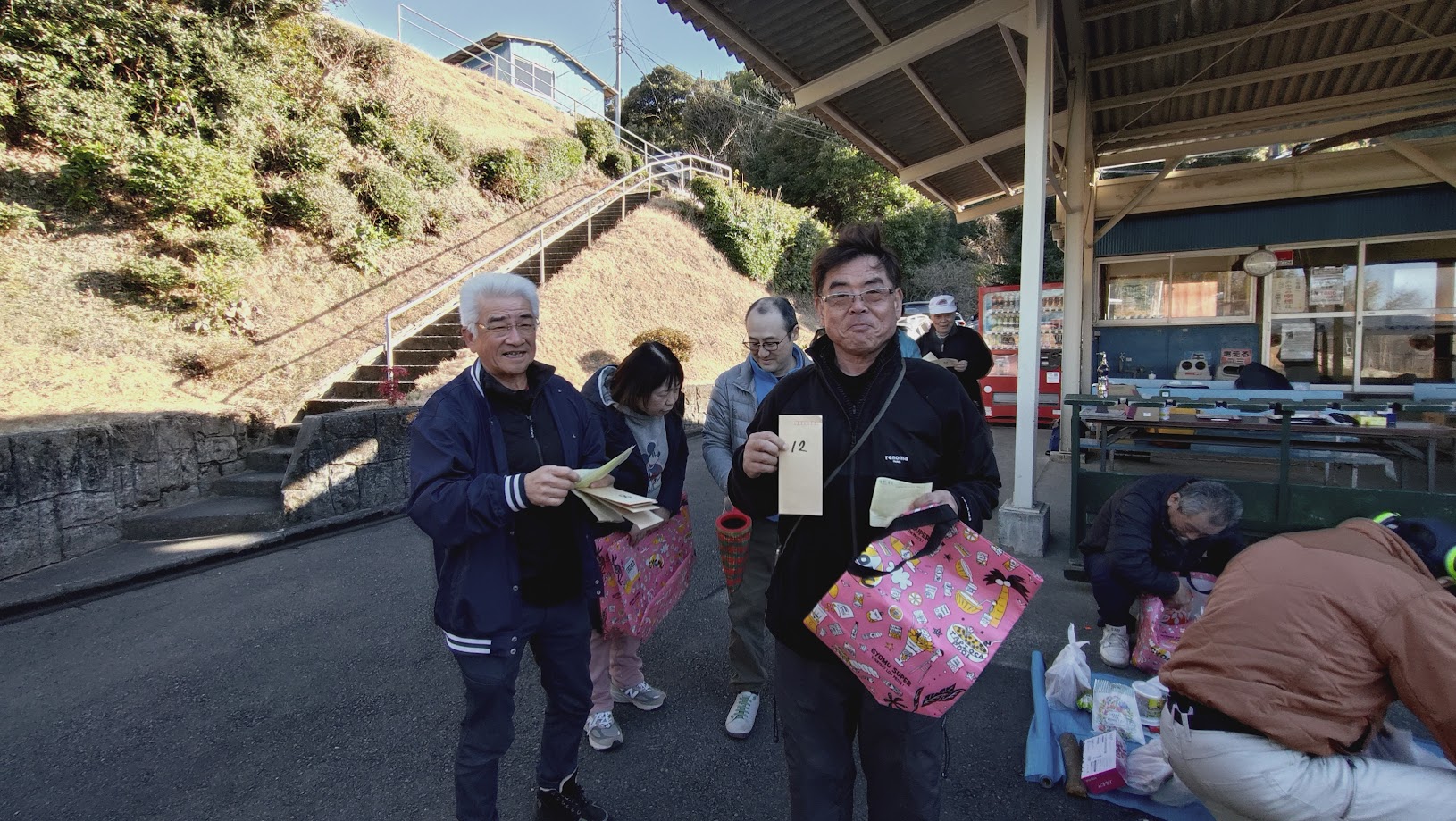 優勝者からクジ引で番号を、景品と弾券をGET この時が皆さん 楽しみの様です 自分は豚焼肉たれ漬けを 12K 青島ミカン20K等を~