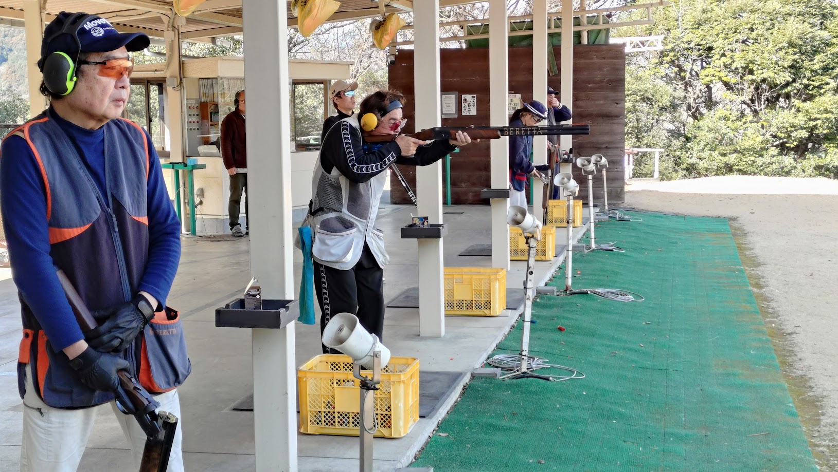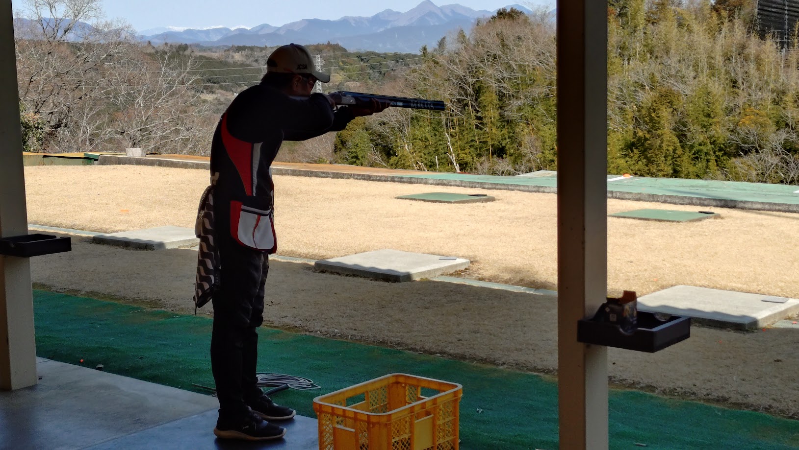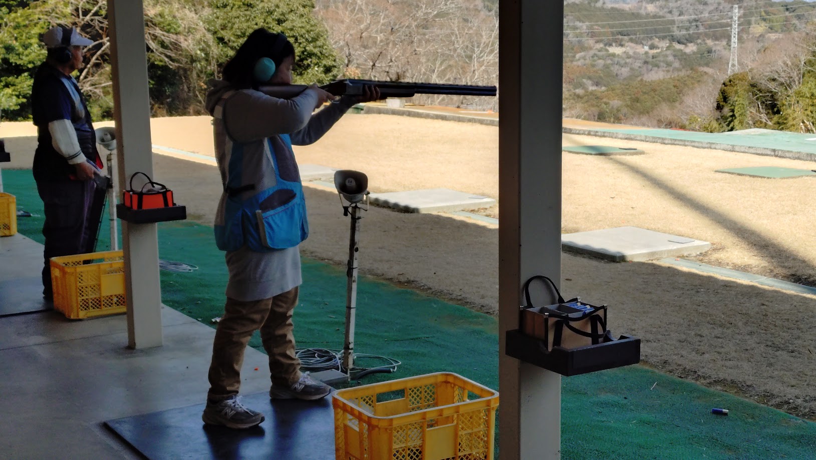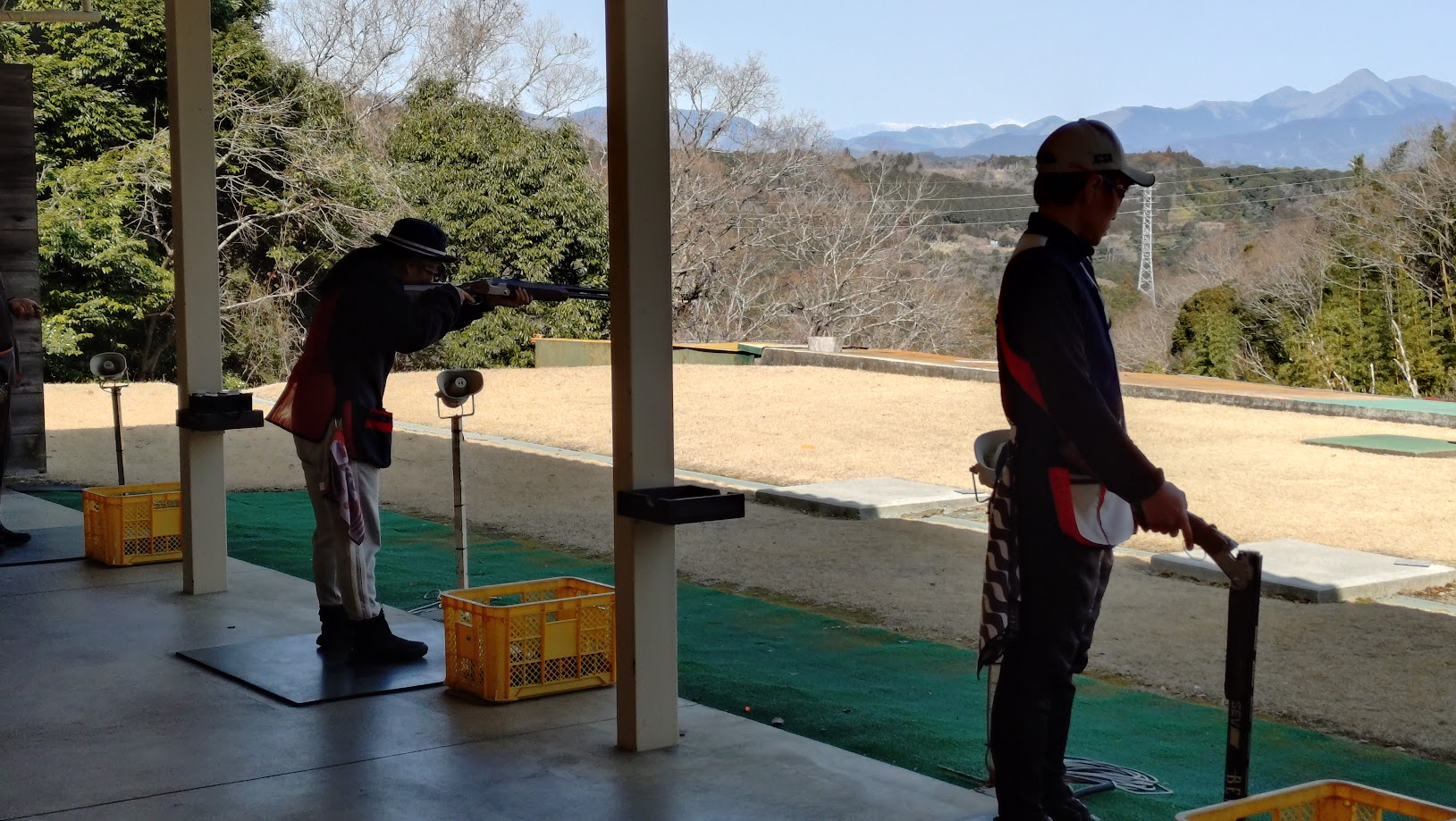 1ボードのスタート 朝特有の季節風です 花粉を飛ばしてるなぁ 左のクレーは 35 度で2段階で階段の様に舞い上がり5番射座では